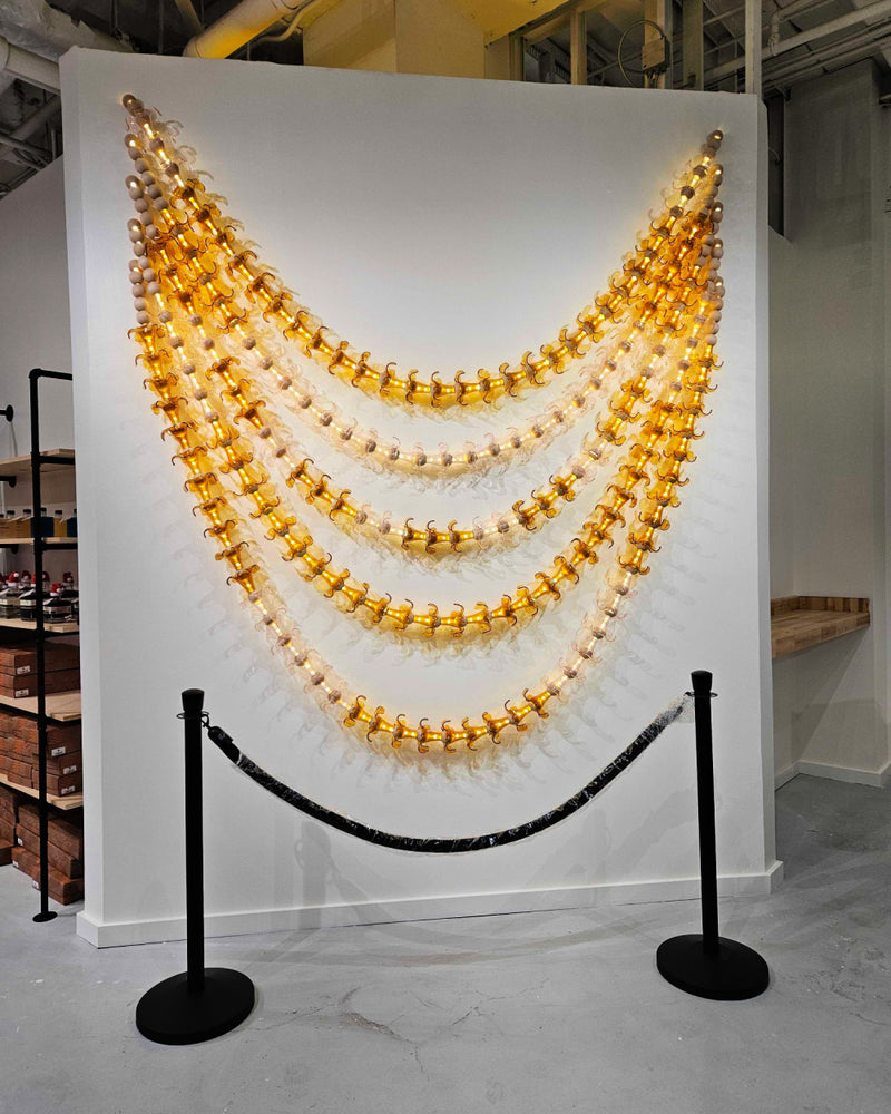A luminous space anchored by a custom glass lei wall by North Shore artist Arlie Pemberton, founder of Arlie Glass.